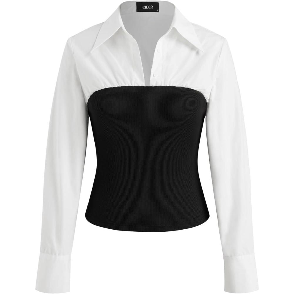 CIDER Collar Patchwork Button Long Sleeve Blouse(White)