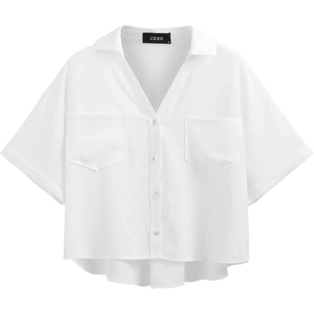 CIDER Collar Pocket Short Sleeve Crop Blouse(White)