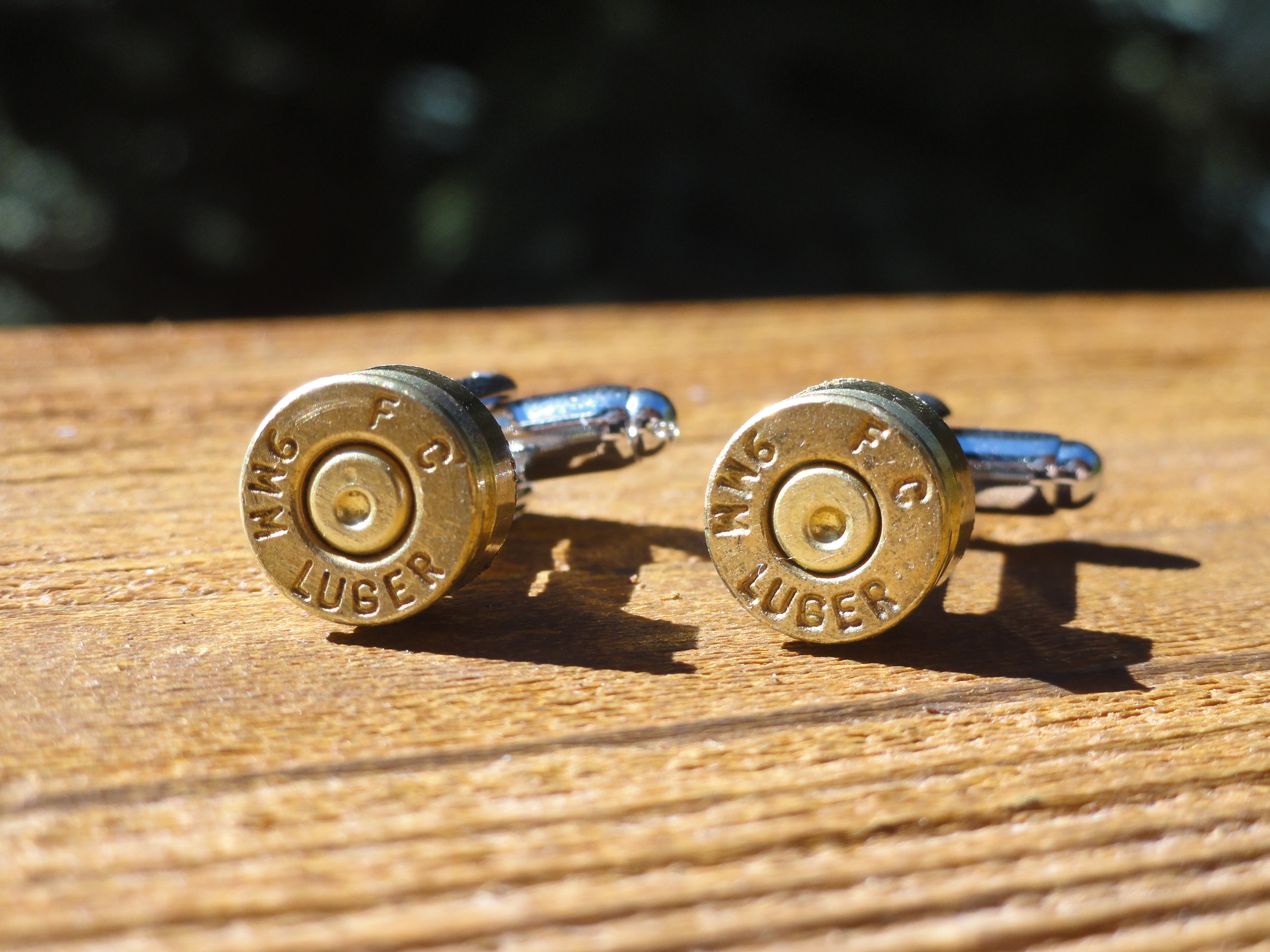 Brass 9x19mm Ammo Cufflinks , Lapel Pin, Tie Bar and Earrings